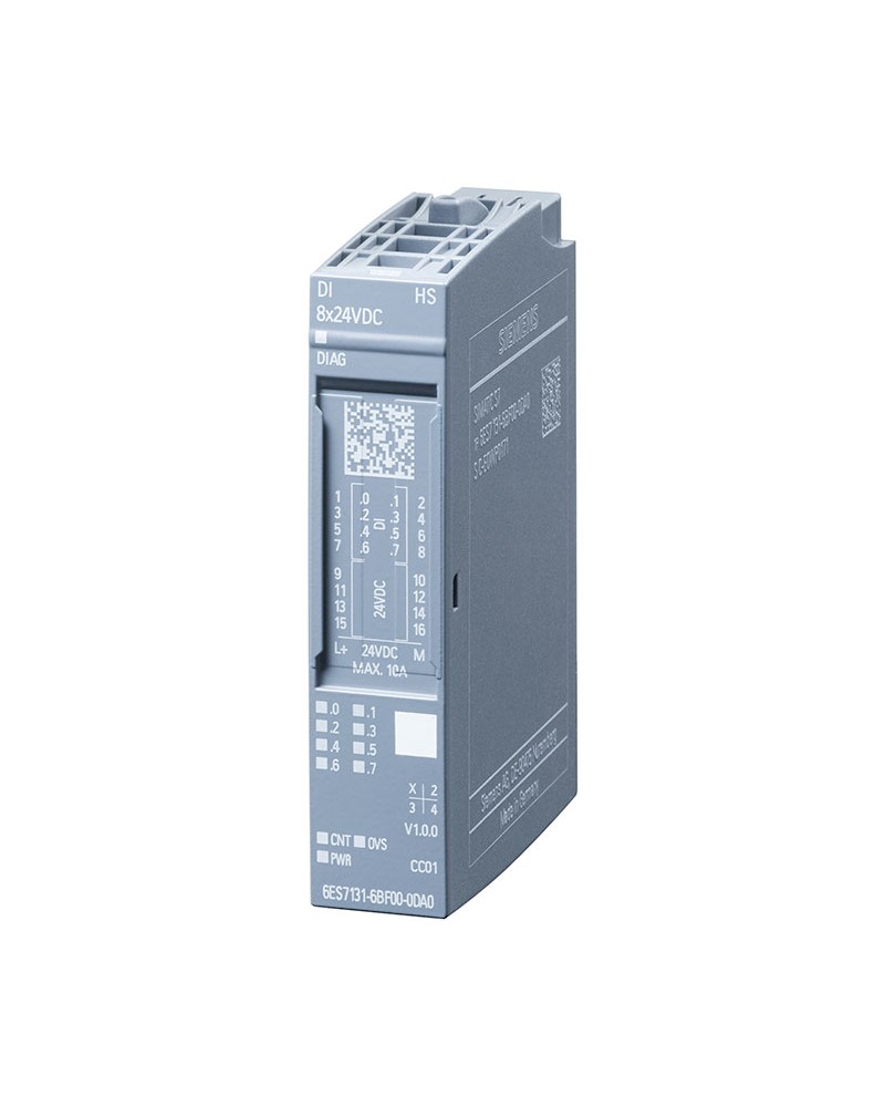 SIEMENS, Modulo di input e output digitale serie I/O SYSTEM 750, 8x ad alta velocità 24 V c.c. appartenente alla serie SIMATIC ET 200SP, adeguato per il tipo BU A0, ha una modalità di funzionamento DI, sovra campionamento e contatore. Colore codice CC01. Peso: 28g. Presente funzione diagnostica. Intervallo temperatura d esercizio per installazione verticale: tra -30 °C e 50 °C. . Intervallo temperatura d esercizio per installazione orizzontale: tra -30 °C e 60 °C.